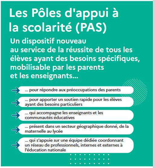 Les pôles d’appui à la scolarité sont un nouveau service rendu aux parents et responsables légaux d’enfants présentant des besoins éducatifs particuliers, en même temps qu’une organisation qui vient en appui des professeurs équipes pédagogiques (ça englobe plus de professionnels), au sein même des classes ou dans des lieux dédiés implantés dans les écoles et établissements.