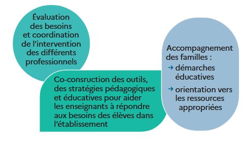 – mobiliser, au sein de l’éducation nationale ou des établissements médico-sociaux, différents professionnels : de la pédagogie et des apprentissages, de l’éducation spécialisée, du soin et de la rééducation.